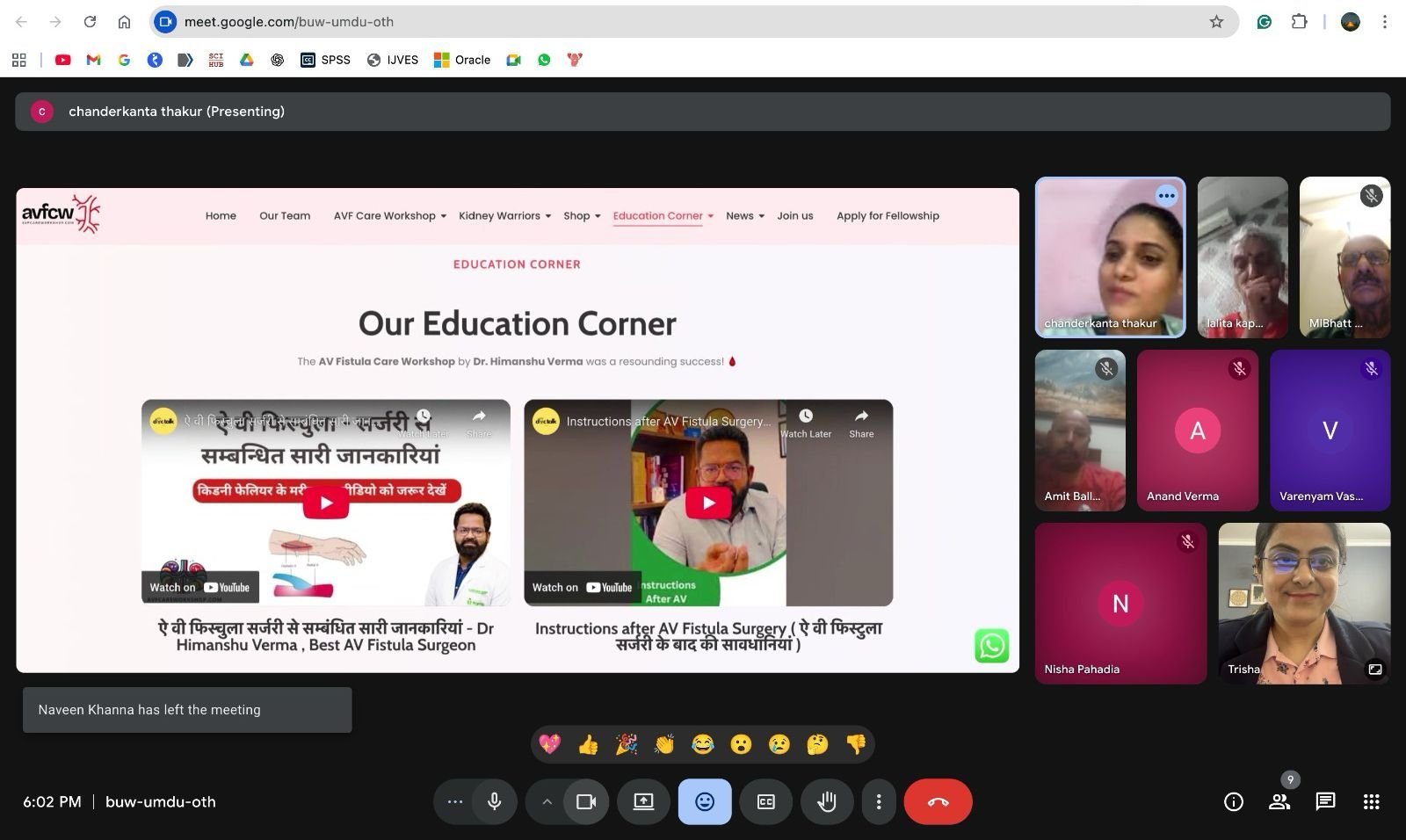The 13th AVF Care Workshop was successfully conducted online on 30th October, focusing on educating and engaging dialysis patients. A total of 22 CKD patients attended the online session, making it an active and meaningful learning experience. The session aimed to introduce them to the evolving world of technology, particularly the use of Artificial Intelligence (AI), a friendly diet coach for them, in managing their renal diet more effectively.